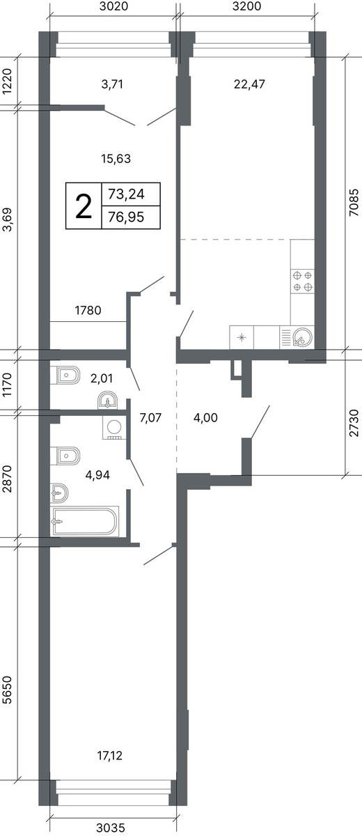 2-комнатная  76.6 м2