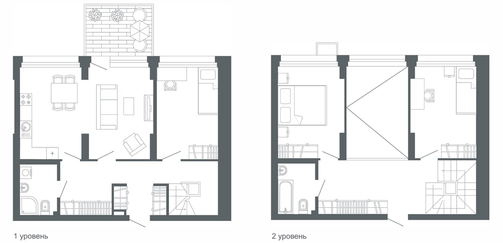 Такой формат помогает зонировать пространство под разные потребности.Для молодой пары это возможность организовать уютное рабочее место или зону для хобби на одном из уровней, сохраняя личное пространство. Для семьи — место, где родители могут расслабиться на первом этаже, а ребёнок играть или учиться на втором. И никто никому не мешает.