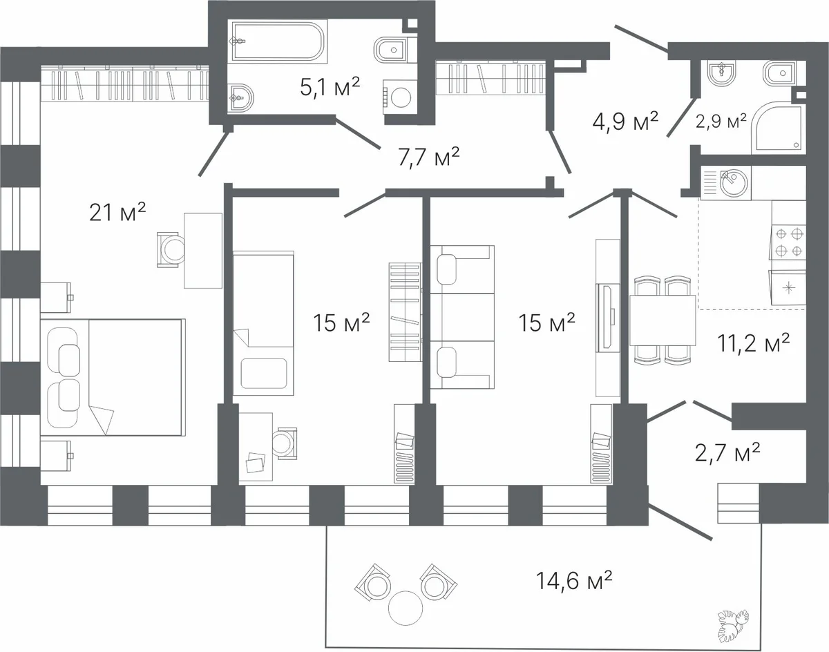 Террасы мгновенно становится излюбленным местом притяжения для всех членов семьи. Она создаёт ощущение загородного дома. Здесь можно устраивать завтраки на свежем воздухе, работать за ноутбуком под пение птиц и провожать закаты, обсуждая планы на будущее.