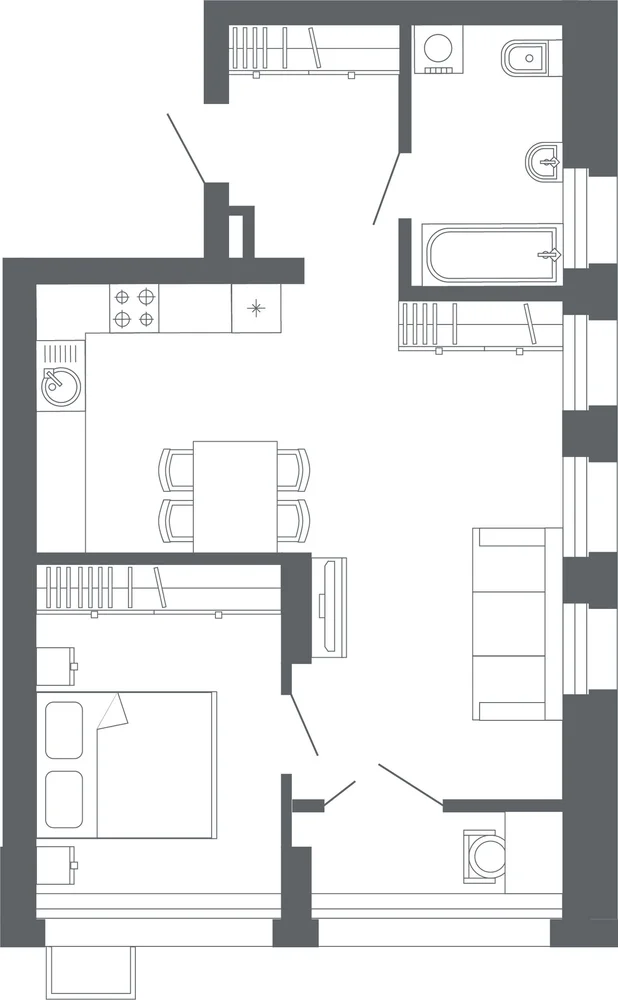 Пространство продумано до мелочей: отдельная ванная и гардеробная создают приватную зону для отдыха и заботы о себе.  Ещё одно необычное решение — стильное окно в ванной с видом на город. Такие решения подойдут тем, кто любит неординарность во всем, даже в организации пространства.