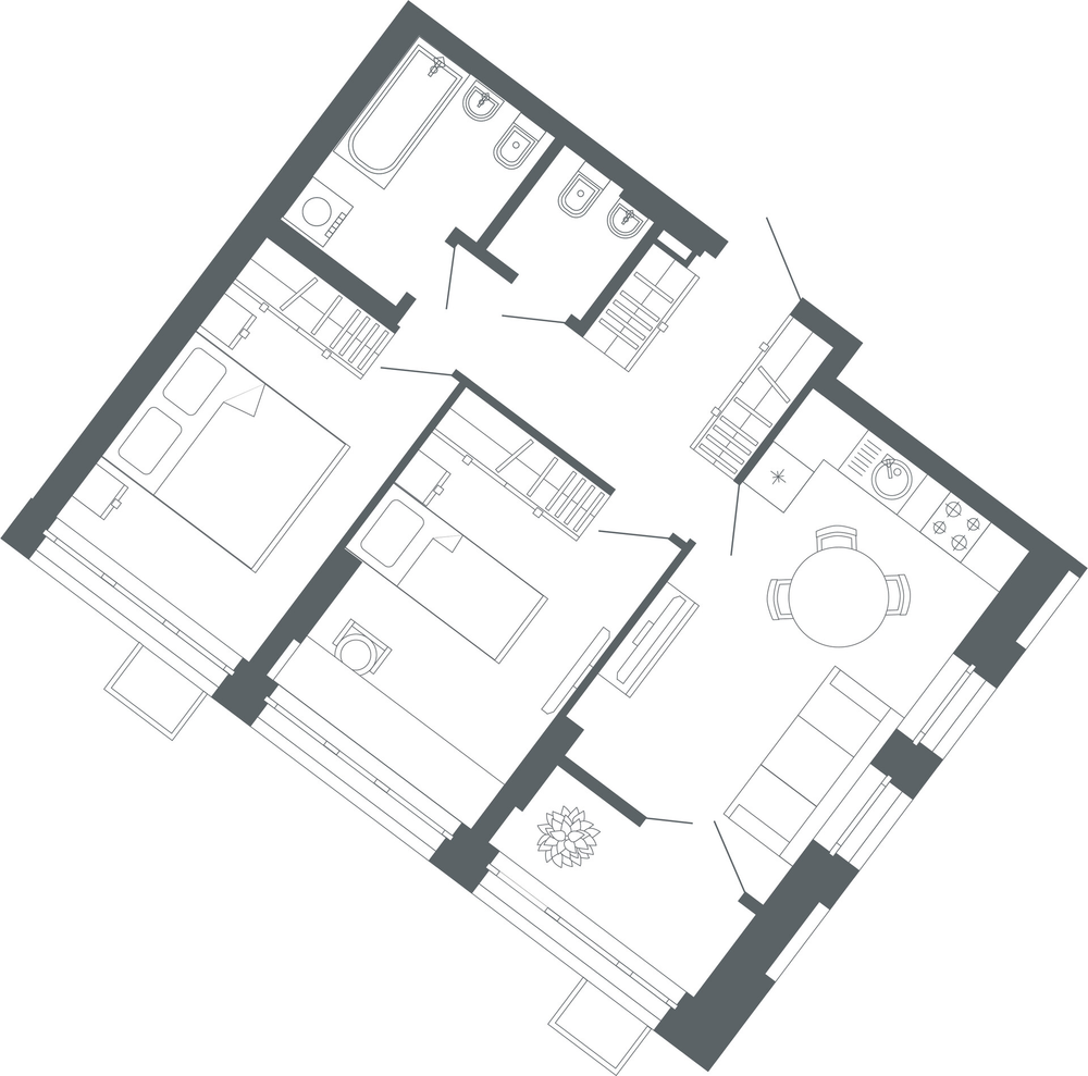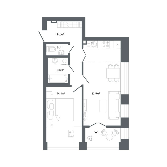 1-комнатная  54.9 м2