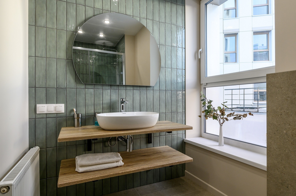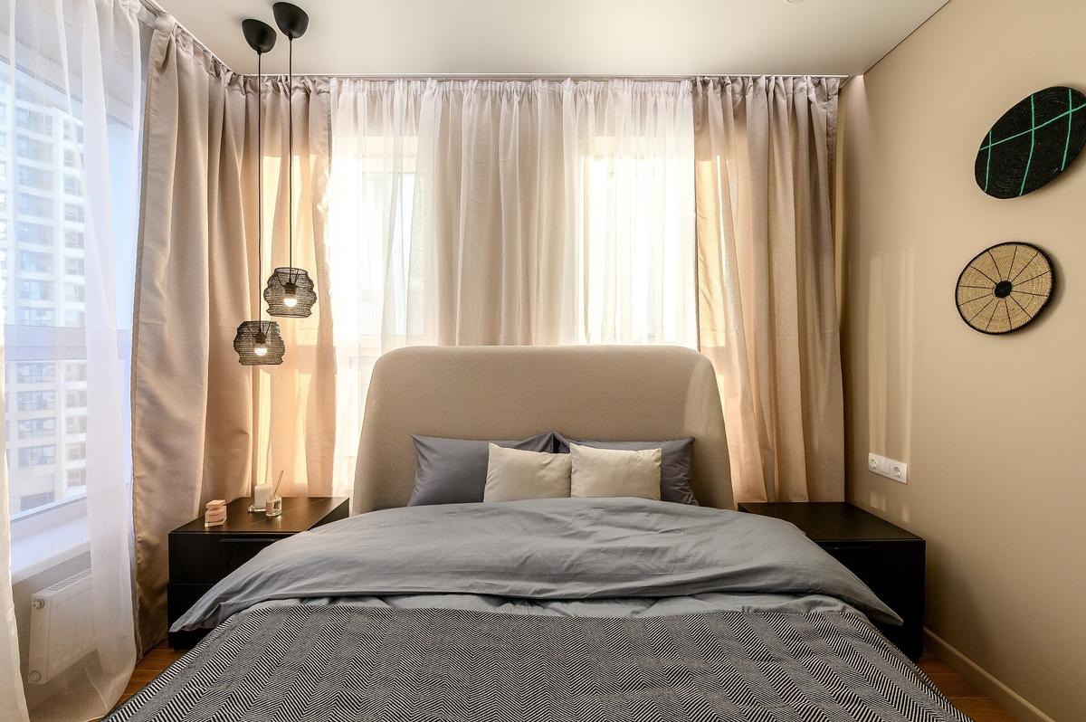Пространство продумано до мелочей: отдельная ванная и гардеробная создают приватную зону для отдыха и заботы о себе.  Ещё одно необычное решение — стильное окно в ванной с видом на город. Такие решения подойдут тем, кто любит неординарность во всем, даже в организации пространства.