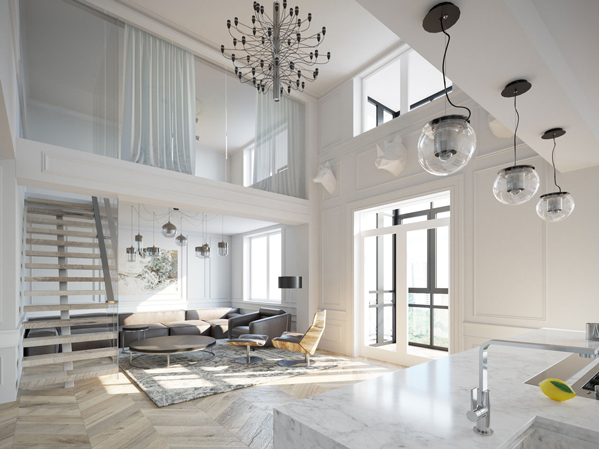 В таком пространстве есть, где разгуляться фантазии — ведь даже самые необычные идеи здесь будет очень легко воплотить. Например, организовать антресоли — оригинальный формат, при котором спальню или кабинет можно расположить наверху. Получится очень уютно и приватно.