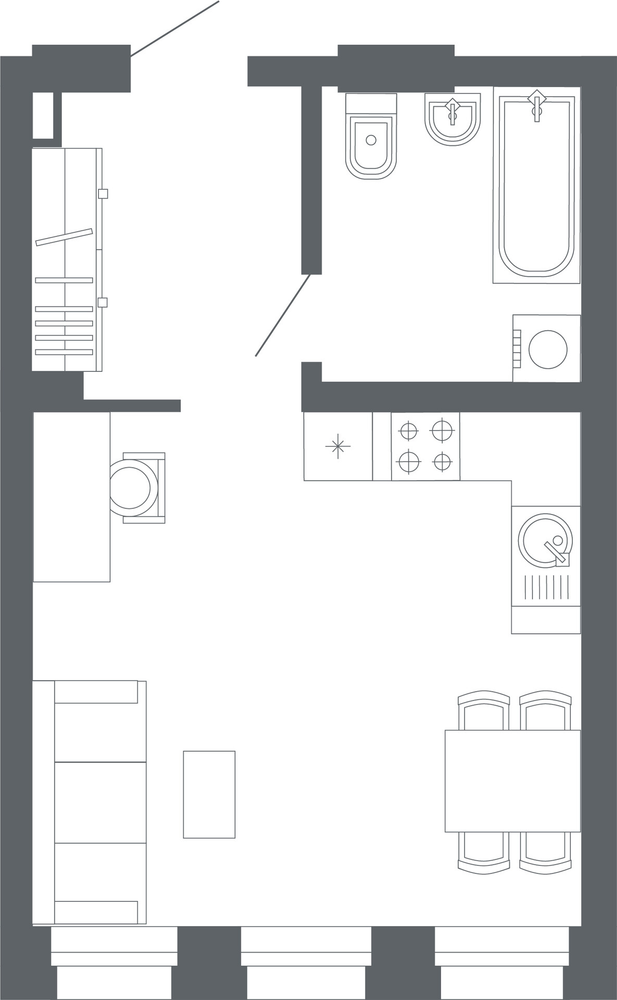 Пространство продумано до мелочей: отдельная ванная и гардеробная создают приватную зону для отдыха и заботы о себе.  Ещё одно необычное решение — стильное окно в ванной с видом на город. Такие решения подойдут тем, кто любит неординарность во всем, даже в организации пространства.