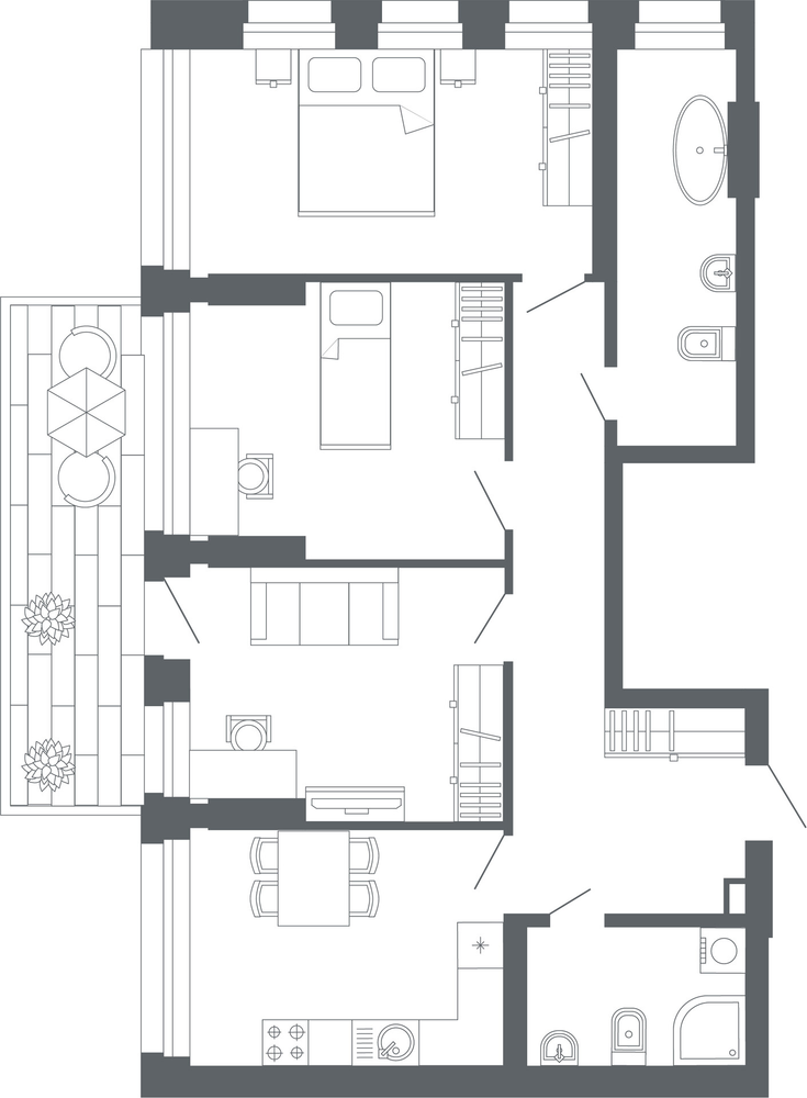 Террасы мгновенно становится излюбленным местом притяжения для всех членов семьи. Она создаёт ощущение загородного дома. Здесь можно устраивать завтраки на свежем воздухе, работать за ноутбуком под пение птиц и провожать закаты, обсуждая планы на будущее.